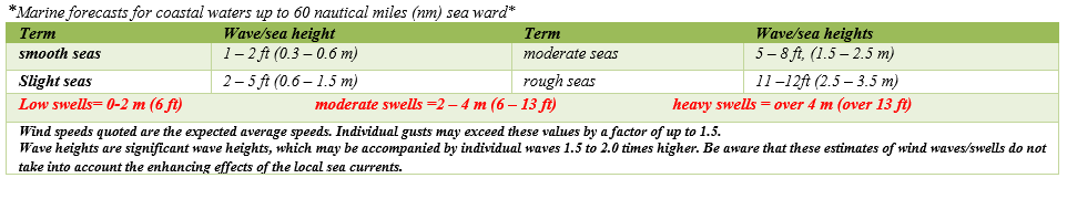 Easterly winds at 05 to 15 knots with slight seas and low northerly swells. Isolated showers and thunderstorms. Further Outlook for Friday: Easterly winds at 10 to 15 knots.