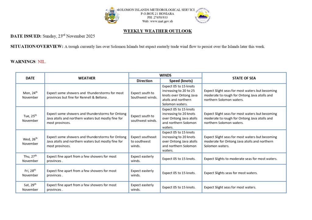 NO WARNING. Weekly Weather Outlook – Solomon Islands Meteorological Services