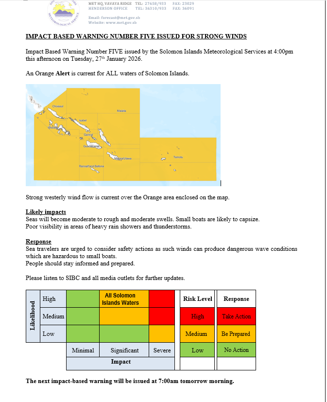 STRONG WIND WARNING NUMBER FIVE ISSUED BY THE SOLOMON ISLANDS METEOROLOGICAL SERVICE AT 4:00PM THIS AFTERNOON ON TUESDAY, 27th JANUARY 2026.