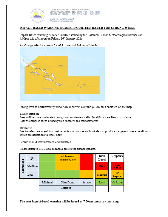 STRONG WIND WARNING NUMBER FOURTEEN ISSUED BY THE SOLOMON ISLANDS METEOROLOGICAL SERVICE AT 4:00PM THIS AFTERNOON ON FRIDAY, 16th JANUARY 2026.