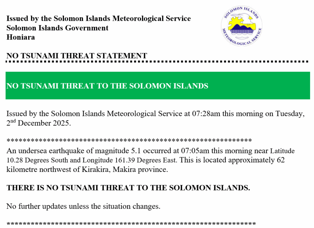 NO WARNING. Tsunami Bulletin – Solomon Islands Meteorological Services
